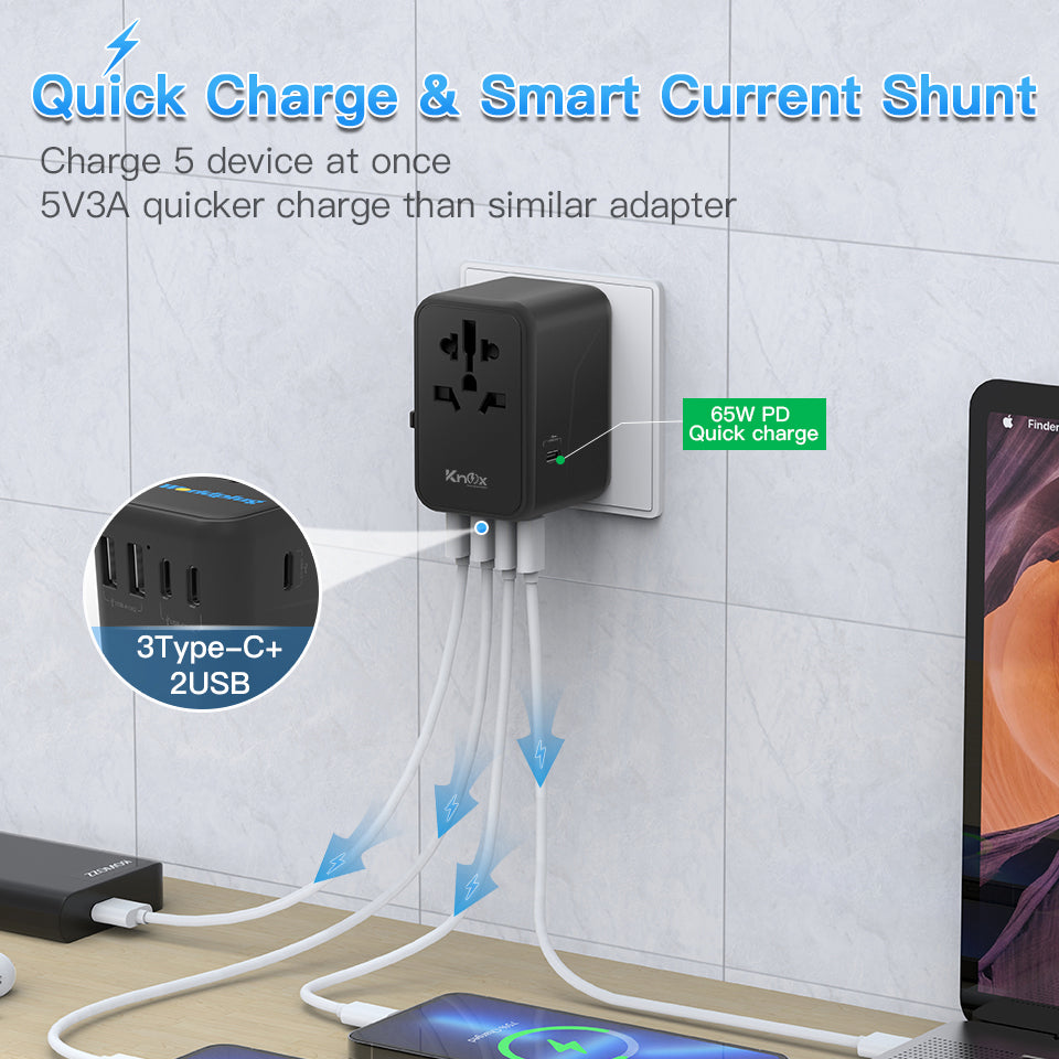This 65W universal adapter delivers powerful and efficient charging wherever you travel. With three USB C and two USB A ports, it supports multiple devices at once. The advanced GaN III chipset ensures faster and cooler performance, while built in safety features protect against spikes and overheating. Compact, durable, and perfect for power users on the go.