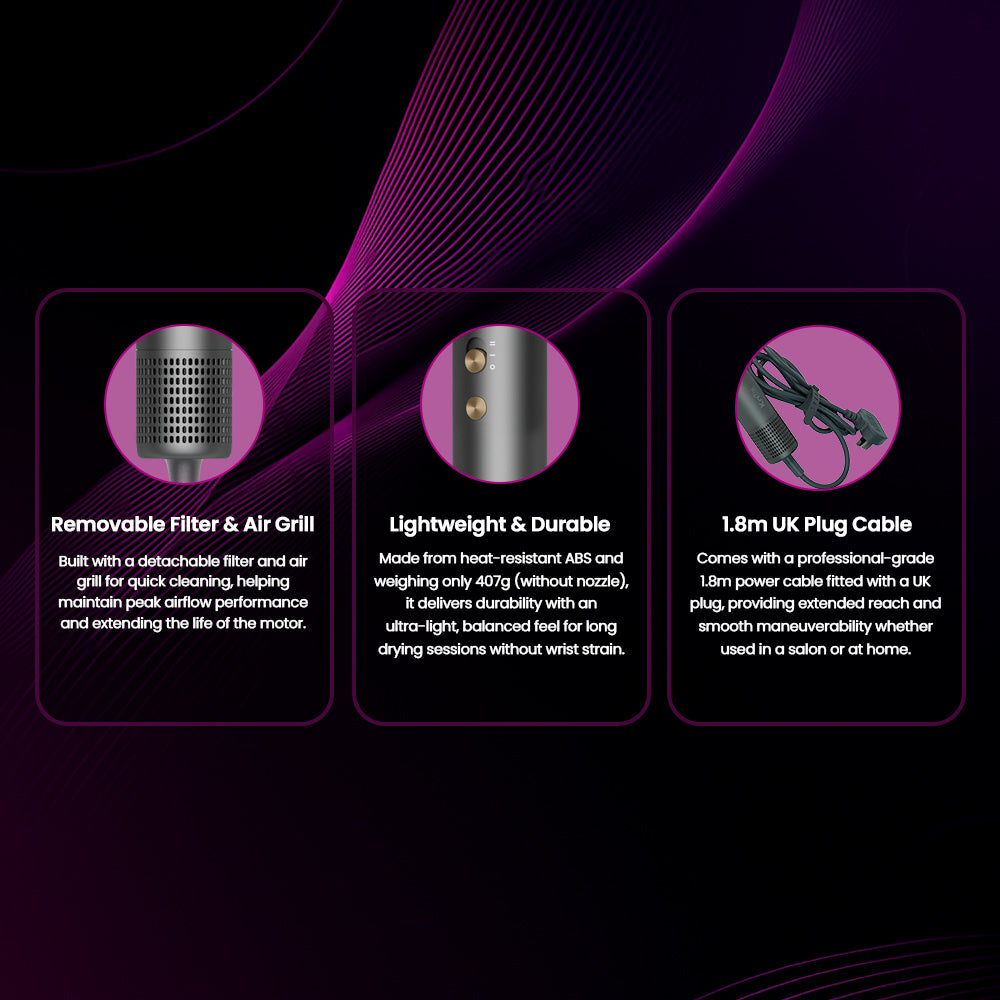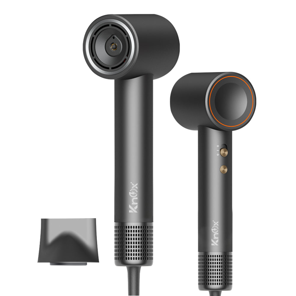 Introducing the Knox AuraDry, a next-generation high-speed hair dryer engineered for salon-quality styling at home. Featuring a 110,000 RPM High Speed brushless motor, Ai Smart Heat Control, and advanced ionic technology, it delivers ultra-fast drying with maximum hair protection. Equipped with Ai intelligent temperature monitoring, AuraDry prevents overheating and helps maintain hair’s natural shine. With 200 Millions ions/cm³, it reduces frizz, smooths fly-aways, and enhances softness for a glossy, healthy finish every day. It's lightweight 407g ABS body, low-power 1400W, low-noise performance, and 360° magnetic styling nozzle make it effortless for both professionals and daily users. Choose from 5 temperature modes and 2 airflow speeds to achieve blowouts, sleek straight looks, curls, or natural volume.